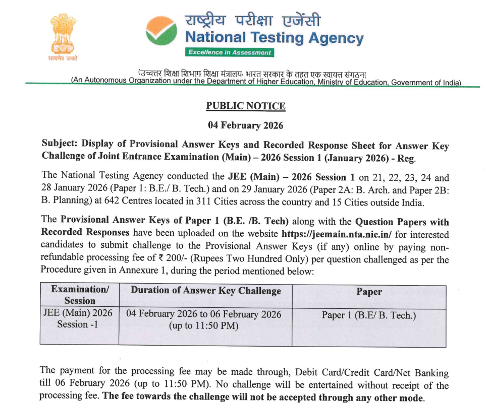 The JEE Main 2026 answer key was officially released on February 4, 2026, on the official NTA website. Students can find the official notification in the public notices section.