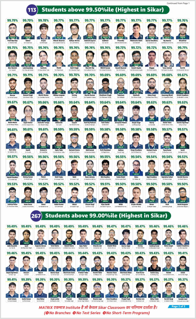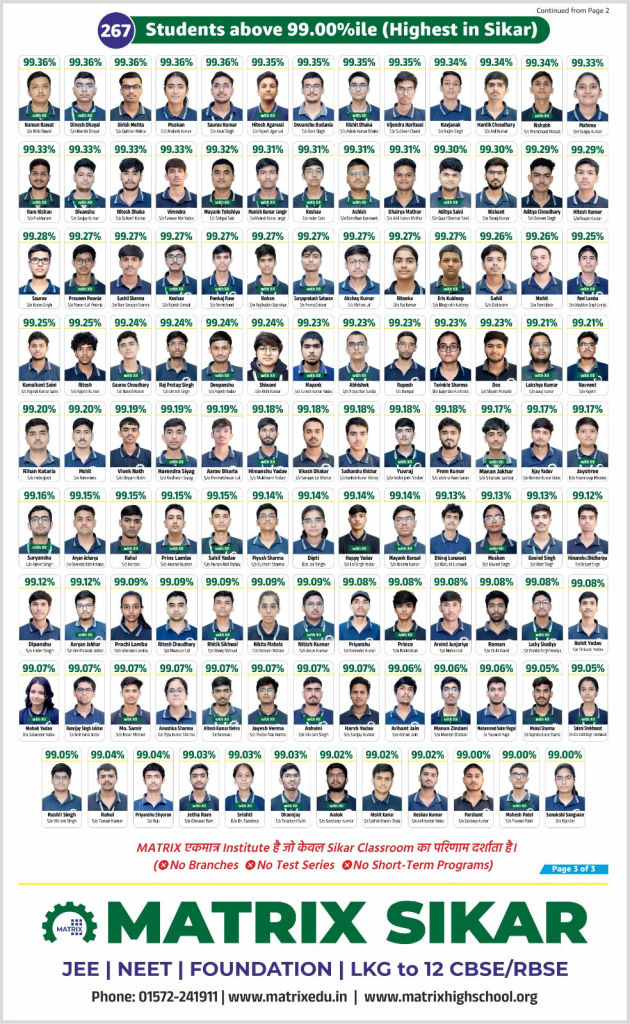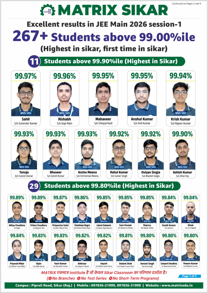 Matrix JEE Academy has once again proved its excellence by exceptional performance in JEE Main 2026 Session 1 from Matrix JEE students. The JEE Main Session 1 has concluded, and many students from Matrix JEE Academy have scored above 99.95 percentile. Highest results in Sikar, 267+ students from Matrix scored above 99 percentile.