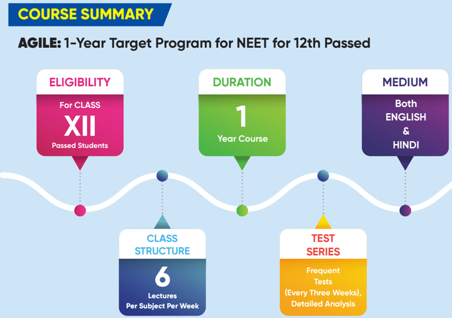 Matrix Academy’s Agile program is a 1-year targeted program for the 12th pass students, which is based on scholarships from 10th class board results, MSAT, and Olympiad performance. The Agile course is for students who have completed or passed the 12th-grade exam and are now focusing independently on the NEET exam. This program is developed with the belief that students have already completed the 12th class with basic fundamental knowledge, and are looking to improve existing knowledge and concepts to perform well in the final exam.