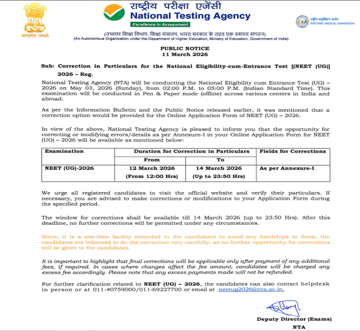 As per this latest notification from NTA issued on 11 March 2026, the correction window for the NEET UG 2026 application form will be opened between 12 March 2026 and 14 March 2026.